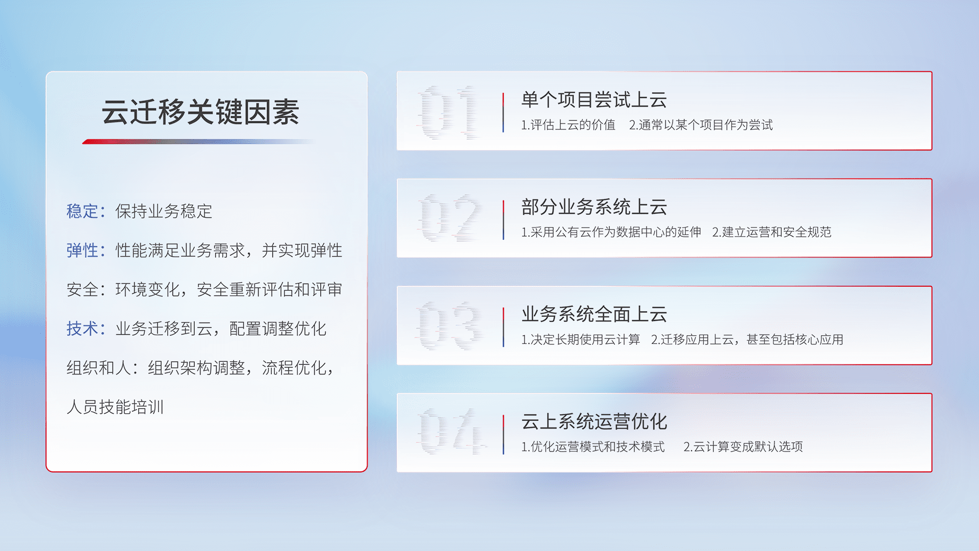 结合实际业务,,,从规划设计、、、、云平台选型、、、云原生改造、、、数据迁移、、集成交付,,,,迁移全过程为客户识别最佳上云路径,,,,做好风险识别管理,,设计网络架构、、、身份权限、、安全审计合规、、操作审计、、日志审计、、、监控告警策略、、多站点容灾设计等,,,,对云上基础设施进行整体规划,,,,提升IT治理水平,,,,以满足弹性、、高可用、、高性能的需求。。