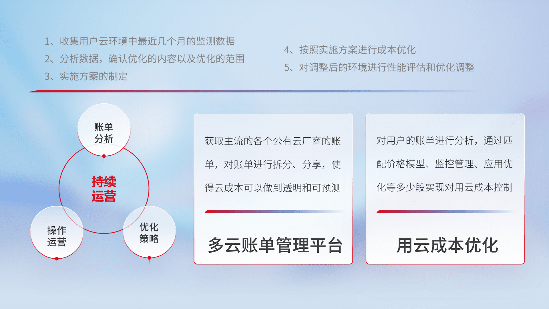 通过多云纳管,,以统一的资源数据模型把客户的云资源进行抽象和封装,,,,进而实现对多云资源的统一操作,,,,保障云资源管理的可靠性、、、稳定性与可用性。。量身定制化运维内容,,配置、、开发运维、、、、补丁管理、、备份、、监控、、认证和访问管理、、、审计和日常巡检等,,,保障在用云过程中的可靠度,,,稳定度以及高可用率。。
